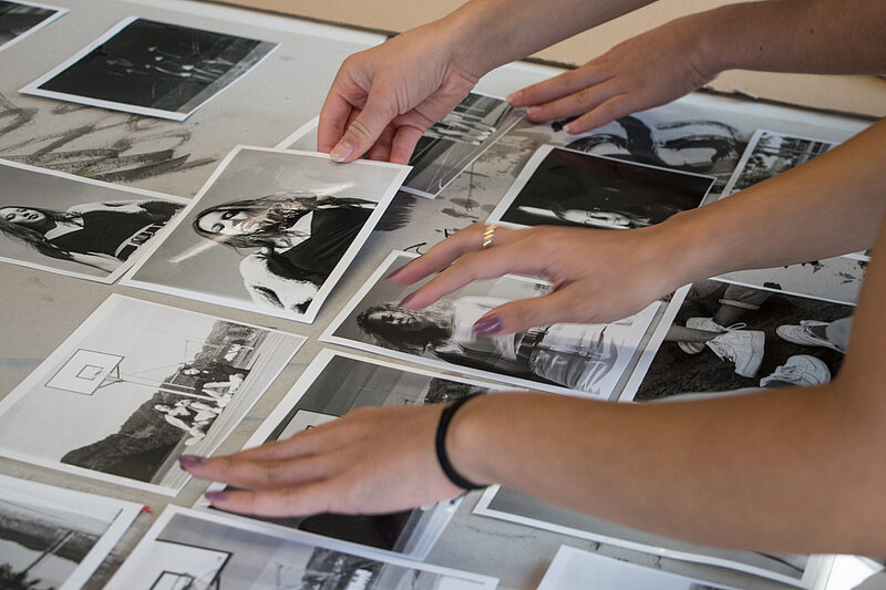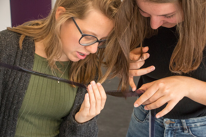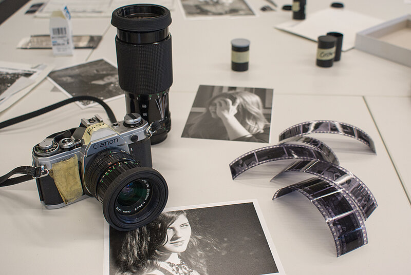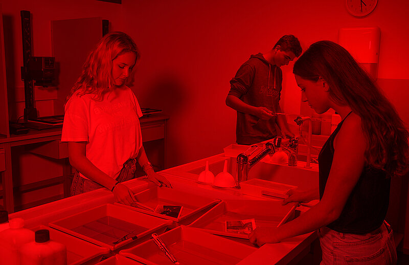 Im Fotolabor entwickeln die Schülerinnen und Schüler ihre Schwarzweissfilme in der Dose und zaubern aus den Negativen mit dem Vergrösserer Fotoabzüge auf Papier. Dieses entschleunigte Verfahren führt weg vom raschen Knipsen zu einem sinnlichen Einfangen von faszinierenden Augenblicken.